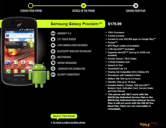Samsung Galaxy Proclaim được trang bị màn hình 3.5 inch với độ phân giải 320 x 480 pixel, bộ xử lý lõi đơn 1GHz, và camera 3-megapixel phía sau. Hơn nữa, gói Android 2.3 Gingerbread mới toanh càng khẳng định vị trí hiện tại của Galaxy Proclaim trên bảng xếp hạng smartphone cao cấp.