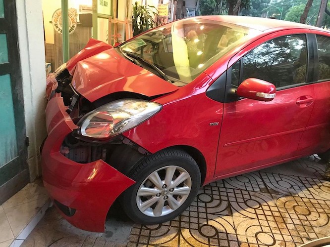 Vụ tai nạn xảy ra tại phố Hàng Hài vào chiều hôm qua (ngày 25/11) khiến một nam thanh niên bị xây xước nhẹ. Cửa kính quán trà chanh bên đường bị tông vỡ nát. Phần đầu xe Toyota Yaris hư hỏng nặng. May mắn vụ tai nạn trên không bị thiệt hại nặng về người.