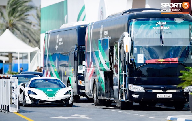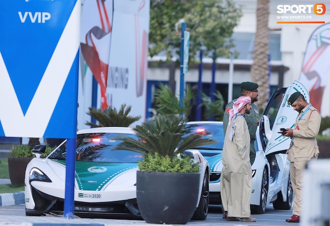 Hộ tống đoàn cầu thủ Việt Nam đến sân Al-Maktoum có 2 chiếc siêu xe mới toanh. Chiếc dẫn đầu là McLaren 570S, có giá trị dưới 200.000 USD. Ảnh: Hiếu Lương.