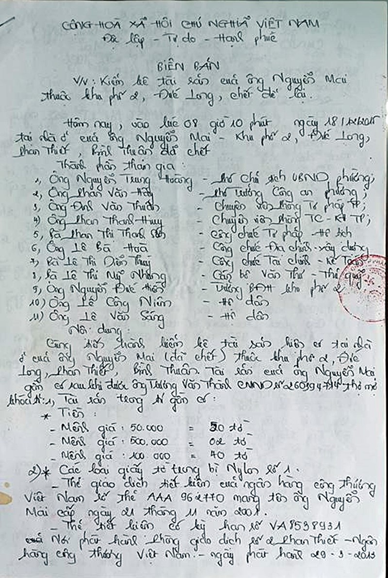 Theo biên bản kiểm kê thì số tài sản mà ông Nguyễn Mai để lại gồm: 7,5 triệu đồng tiền mặt, một giấy chứng nhận quyền sử dụng nhà, một thẻ giao dịch tiết kiệm cấp năm 2001 mang tên ông Nguyễn Mai; một thẻ tiết kiệm có kỳ hạn tại phòng giao dịch số 2 Phan Thiết thuộc Ngân hàng Công thương Việt Nam với số tiền gốc là 50 triệu đồng.