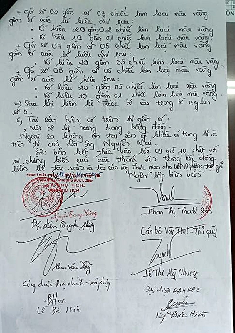 Tổ kiểm kê còn phát hiện 5 túi nilon bên trong chứa kim loại màu vàng. Ký hiệu trên các chiếc kim loại màu vàng này là 10, 20, 30, 40, 50 tùy từng chiếc nhẫn. Tổng số chiếc kim loại màu vàng này là 33 chiếc. Ngoài ra còn một số tài sản khác… Sau khi kiểm kê, số tài sản của ông Nguyễn Mai đã được niêm phong và giao cho UBND phường tạm quản lý.