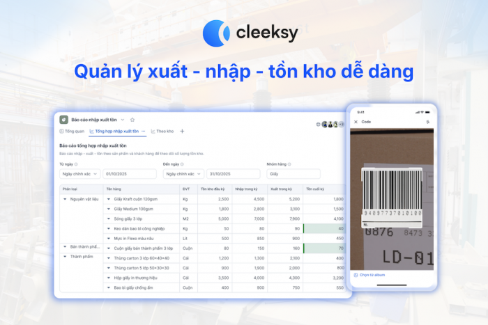 Cleeksy còn hỗ trợ quản lý kho bằng QR code/barcode để kiểm soát xuất - nhập - tồn theo từng lô và hạn chế sai sót. Mọi thao tác được cập nhật tự động và liên thông giữa các phòng ban, loại bỏ việc đối chiếu thủ công và đảm bảo dữ liệu luôn chính xác.