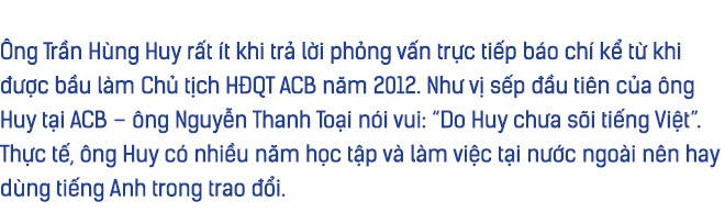Ông Huy rót nước cho khách từ chiếc bình thủy tinh vào những chiếc cốc cũng thủy tinh, trên bàn hoàn toàn không có chai nhựa. Góp mặt trong buổi phỏng vấn còn có ông Nguyễn Thanh Toại, nguyên Phó Tổng giám đốc ACB – sếp đầu tiên của ông Huy tại ngân hàng và cũng là một trong 27 người đầu tiên làm việc tại ACB.