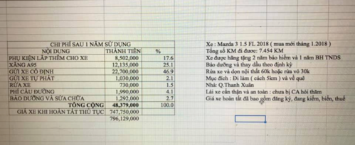 Cụ thể, tôi mua xe Mazda3 bản 1.5 đời 2018 đăng ký tháng 1/2018 hết 747.750.000 đồng gồm tiền xe, thuế trước bạ, phí đăng kiểm, đăng ký, ra biển. Sau một năm tôi chạy tổng quãng đường là 7.454 km chủ yếu là đi làm từ nhà đến cơ quan (khoảng 5 km) và về quê.