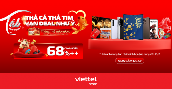 Hòa vào tuần lễ Valentine, Viettel Store triển khai “Thả cá thả tim - Vạn deal như ý” từ 06 - 16/02, với ưu đãi lên đến 68%, hàng ngàn voucher và quà tặng công nghệ hấp dẫn.