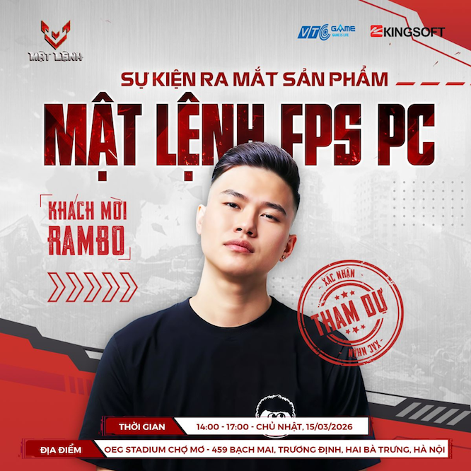Đây cũng là dịp để người hâm mộ gặp gỡ trực tiếp Rambo, tham gia các hoạt động nhận quà hấp dẫn và cùng chứng kiến sự kiện đổ bộ Việt Nam đầy mạnh mẽ của Mật Lệnh – tựa game FPS từng vang danh tại các giải đấu khu vực.