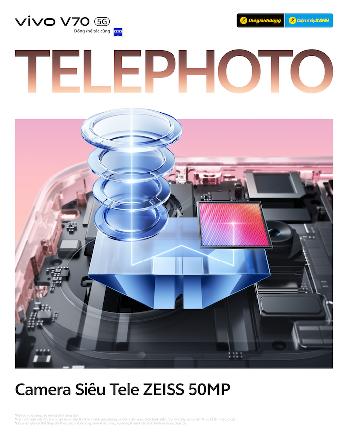 Tiếp nối định hướng phát triển hình ảnh trên V Series, vivo V70 là bước tiến mới trong trải nghiệm nhiếp ảnh chân dung khi tích hợp Camera siêu tele ZEISS 50MP, Camera chính ZEISS OIS 50MP, Camera góc siêu rộng ZEISS 8MP và Camera selfie nhóm ZEISS 50MP hỗ trợ lấy nét tự động. Hệ thống camera đồng chế tác cùng ZEISS cho phép người dùng linh hoạt ghi lại nhiều tình huống khác nhau, từ sân khấu, du lịch đến chân dung cận cảnh, đồng thời duy trì độ chi tiết, khả năng tách chủ thể và chất lượng hình ảnh ổn định. Các tính năng như Chế độ Sân khấu AI – tối ưu khả năng zoom lên đến 10x và giữ chi tiết chủ thể trong môi trường biểu diễn ở khoảng cách phù hợp, cùng khả năng quay video 4K 60fps lần đầu tiên có trên vivo V Series và Khử nhiễu âm thanh AI, mang đến khả năng bắt trọn thần thái nhân vật trong các không gian biểu diễn trực tiếp, từ sân khấu vừa và nhỏ, các khán phòng ấm cúng đến những trải nghiệm du lịch và sáng tạo video ngắn.