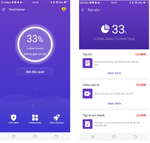 Trong suốt quá trình sử dụng điện thoại Android, chắc chắn các ứng dụng đang hoạt động sẽ sản sinh ra rất nhiều tệp rác. Việc tích tụ các tệp dư thừa này lâu ngày sẽ chiếm hết toàn bộ không gian nhỏ bé của điện thoại. Chỉ với một lần chạm tiện lợi, ứng dụng Nox Cleaner sẽ giúp bạn xóa rác từ dư lượng thừa của ứng dụng, cho đến rác quảng cáo, tất cả đều có thể làm sạch trong tích tắc. Ngoài ra, ứng dụng còn xóa bộ nhớ hệ thống cache còn sót lại từ các ứng dụng đã được gỡ cài đặt nhằm giải phóng tối đa dung lượng điện thoại.