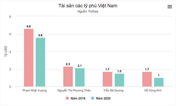 Năm nay không chỉ số lượng tỷ phú của Việt Nam giảm mà tổng tài sản của 4 tỷ phú có mặt trong danh sách của Forbes cũng giảm. Cụ thể, so với năm 2019, tổng tài sản của 4 tỷ phú trên giảm 2,1 tỷ USD. Sở dĩ khối tài sản của 4 tỷ phú Phạm Nhật Vượng, Nguyễn Thị Phương Thảo, Trần Bá Dương và Hồ Hùng Anh giảm là do biến động bất thường của thị trường chứng khoán trong 3 tháng đầu năm.