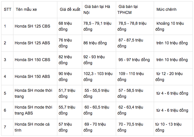 Trong suốt tháng 4 và kéo dài tới đầu tháng 5, giá xe máy Honda có ít sự thay đổi. Trong đó, dòng xe tay ga cao cấp SH và SH mode tiếp tục chênh giá từ 5 - 20 triệu đồng, tùy từng phiên bản và phụ thuộc vào khu vực.