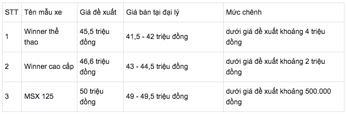 Đối với dòng xe côn tay như Honda Winner và MSX, giá bán tại đại lý vẫn thấp hơn giá đề xuất. Một số tin đồn cho biết, cuối tháng này, Honda Việt Nam sẽ ra mắt dòng Winner thế hệ mới. Tuy nhiên, thông tin này chưa được nhà sản xuất xác nhận.