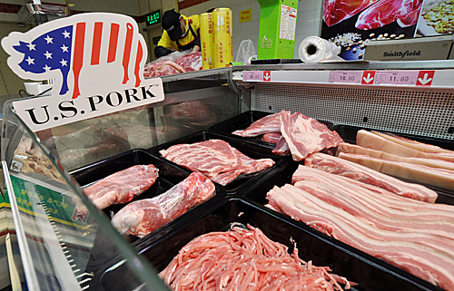 Thịt heo Mỹ bán tại một ngôi chợ ở Trịnh Châu, Trung Quốc. Ảnh: ChinaDaily