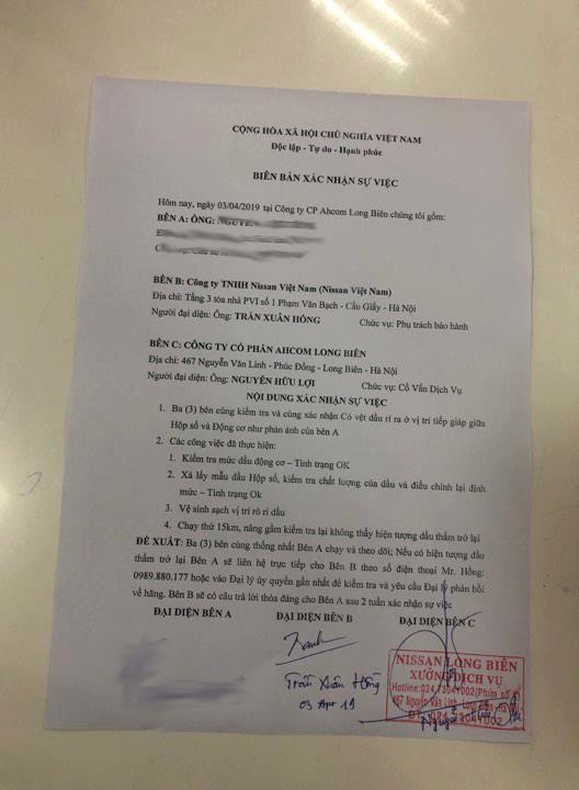 Cũng theo anh Dũng, 4 lần mang xe đến Nissan Long Biên để kiểm tra anh đều làm việc trực tiếp với ông Trần Xuân Hồng, người giới thiệu là đại diện hãng Nissan Việt Nam, có chức danh là phụ trách bảo hành của Công ty TNHH Nissan Việt Nam.