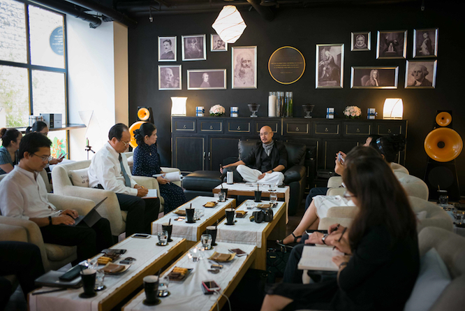 Đúng 10h, ông chủ Trung Nguyên rảo bước tiến vào phòng với trang phục quen thuộc quần trắng, áo vest đen, khăn rằn. Ông Vũ xin phép được ngồi ở tư thế thiền khi trò chuyện.