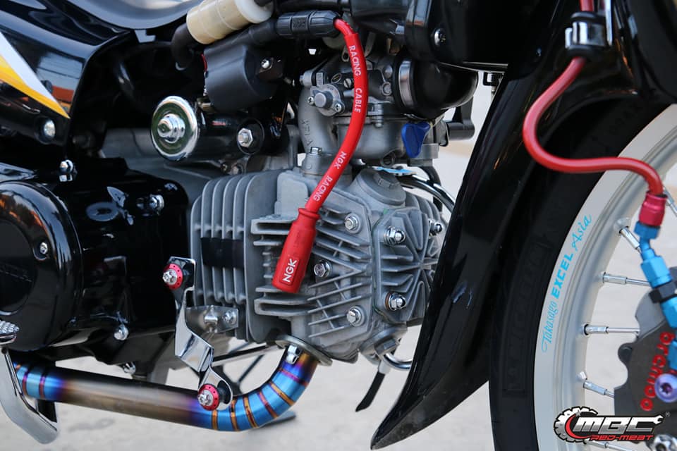 Phần khối động cơ được tăng độ hầm hố sau khi chủ xe lắp thêm bộ nắp đầu Sufat đi kèm cùng sợi mobin sườn NGK đỏ khá nổi bật, chi tiết cổ cô Titan được làm bằng chất liệu khá tốt sẽ tránh được tình trạng bị hoen rỉ trong quá trình sử dụng lâu dài.