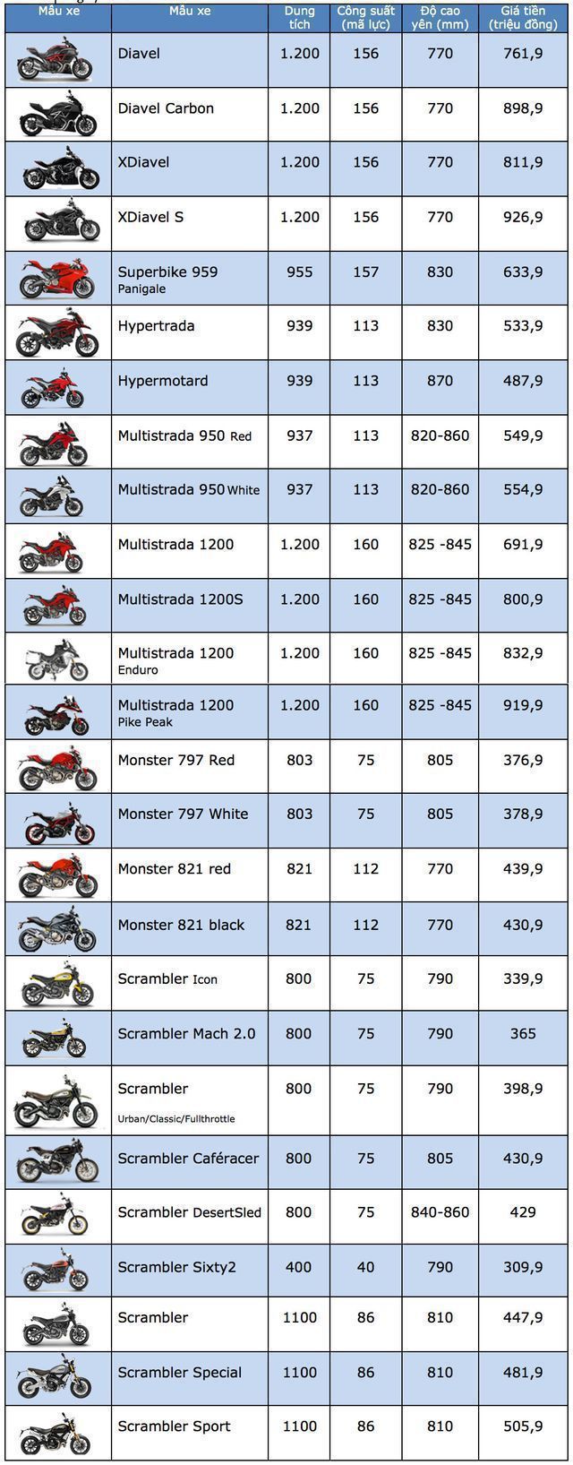 Hiện Ducati Việt Nam bán các dòng xe nhập khẩu từ hai nguồn chính là Châu Âu và Thái Lan. Trong đó mẫu xe có giá bán thấp nhất là Scrambler Sixty2 với mức khởi điểm từ 309,9 triệu đồng và đắt nhất là Multistrada 1200 S giá 926,9 triệu đồng.