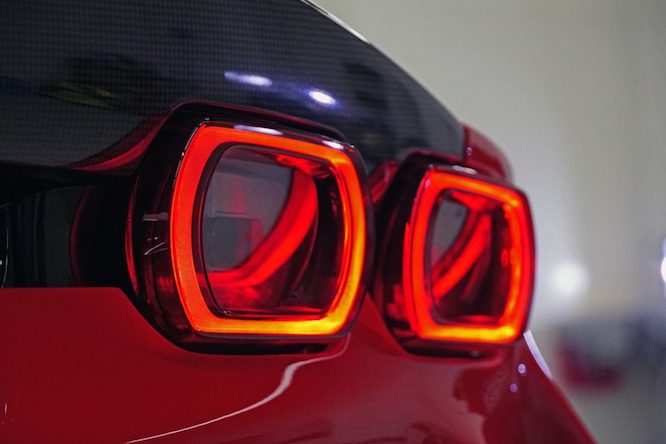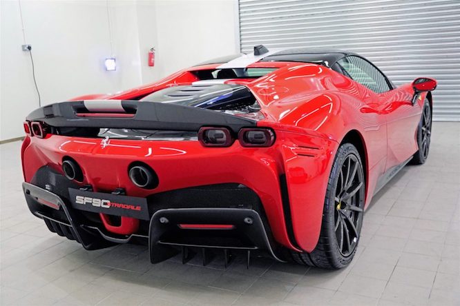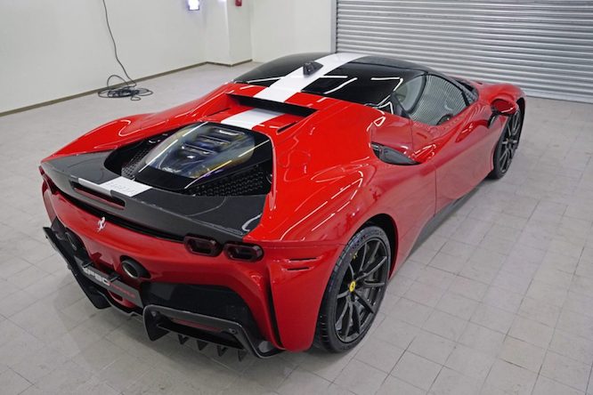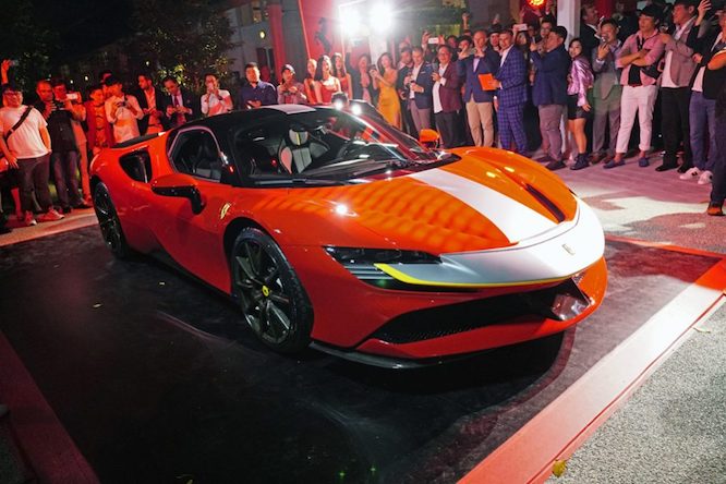 Ferrari – SF90 Stradale là bản kỷ niệm 10 năm hãng siêu xe đến từ Ý đặt chân đến đảo quốc sư tử. Đồng thời đây cũng là lần đầu tiên mẫu xe sử dụng hệ dẫn động hybrid này đặt chân đến Châu Á. Xuất hiện trong buổi ra mắt, Ferrari – SF90 Stradale được khoác lên mình “bộ cánh” màu đỏ Rosso Corsa truyền thống của hãng Ngựa Ý. Nhưng lần này ngoại thất của Ferrari – SF90 Stradale đặt biệt hơn khi được phối hợp đường sọc chạy ngang cản trước và chạy dọc nắp capo. Kiểu phối màu này Ferrari thường sử dụng trên các mẫu xe mang tính lịch sử như dòng xe kỷ niệm 70 năm thành lập của hãng.