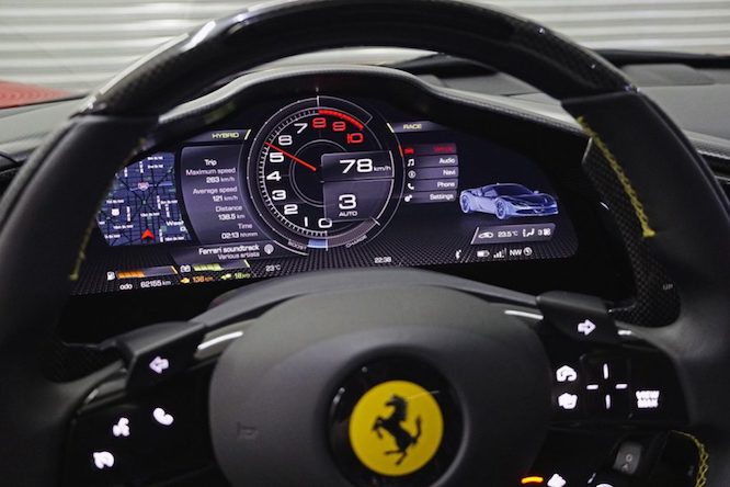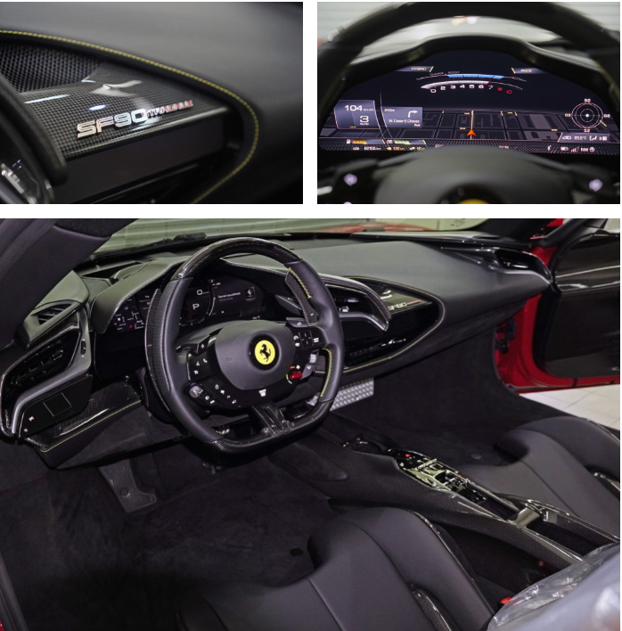 Bên trong nội thất là ghế bọc da màu đen tương phải với đường chỉ may màu vàng. Trung tâm khoang lái là bảng táp-lô, bảng điều khiển trung tâm ốp sợi carbon. Ghế đua Daytona cũng là một trang bị đáng giá trên Ferrari – SF90 Stradale. Vô lăng được thiết kế lại giúp lái xe thuận tiện hơn khi thao tác.