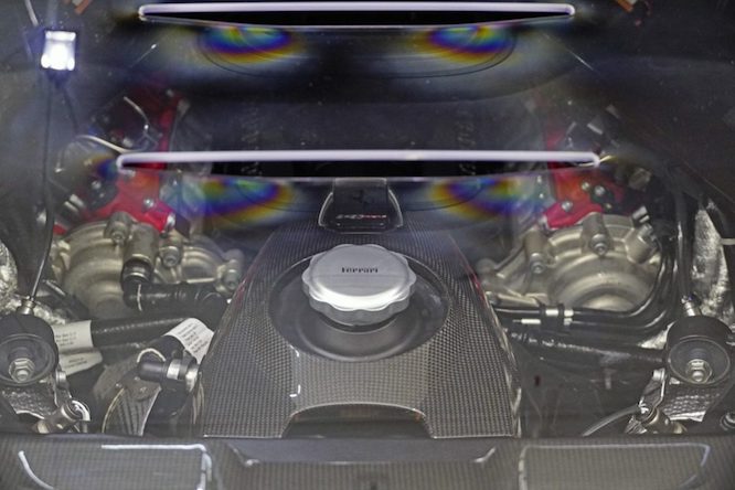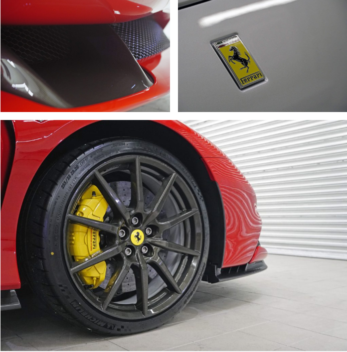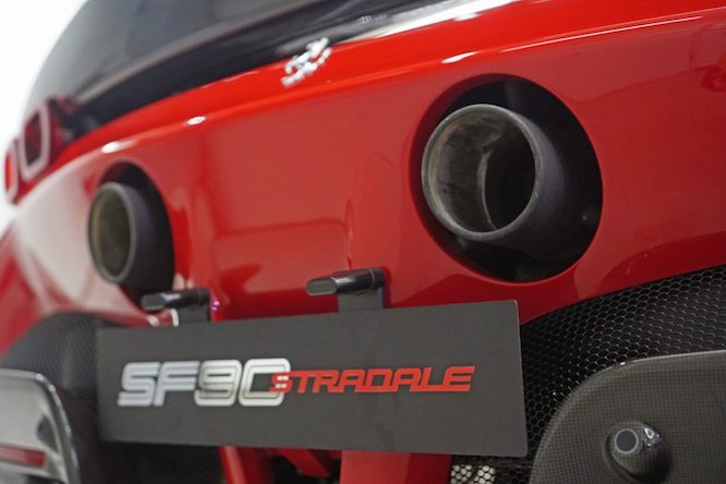 Ngoài điểm nhấn về ngoại thất, Ferrari – SF90 Stradale còn có nhiều chi tiết làm từ sợi carbon như cản trước, mui xe, khung an toàn, cản sau, khoang động cơ khuếch tán và ốp hông. Mâm xe sử dụng thiết kế đa chấu được làm hoàn toàn từ sợi carbon với kích thước 20 inch. Ferrari cũng sử dụng bộ năm ốc cho mâm xe thay vì ốc khoá như trên các mẫu xe hiệu suất cao. Nổi bật trong bộ mâm xe là hệ thống đĩa phanh gốm – carbon, cùm phanh màu vàng.