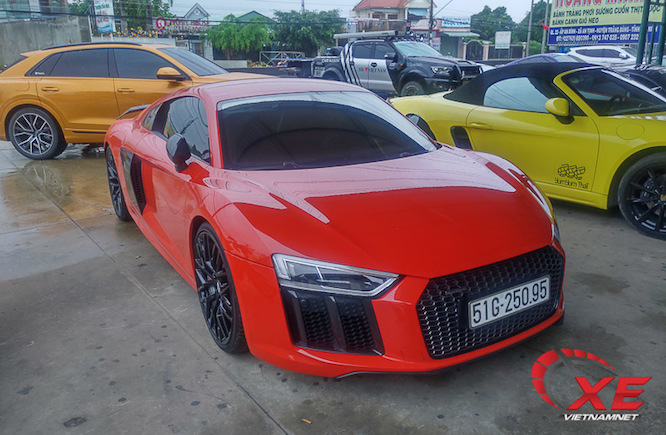 Đặc biệt, xuất hiện tại cửa khẩu Mộc Bài có tới 2 chiếc Audi R8 V10 Plus. Trong đó có một chiếc màu xám và một chiếc màu đỏ. Xe sử dụng khối động cơ V10, dung tích 5.2L. Khối động cơ này sản sinh công suất cực đại 610 mã lực, mô-men xoắn cực đại 560 Nm. Nhờ đó mà Audi R8 V10 Plus chỉ mất 3,2 giây để tăng tốc từ 0-100 km/h trước khi đạt vận tốc tối đa 330 km/h. Tại thị trường Việt Nam Audi R8 V10 Plus có giá khoảng 13-14 tỷ đồng.