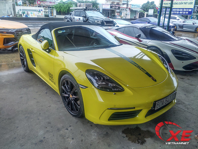 Nổi bật trong đoàn là chiếc Porsche Boxster màu xanh cốm độc đáo. Thiết kế Porsche Boxster chỉ có 2 chỗ ngồi. Porsche Boxster gây ấn tượng với người nhìn bởi thiết kế thể thao, cản trước rộng và cơ bắp. Bên hông xe là phần cánh với thiết kế mới, nằm độc lập vỡi những đường gân trên thân xe. Hốc hút gió lớn kết hợp với hai đường vây cho xe có cảm giác năng động hơn. Giá bán Porsche Boxster tại thị trường Việt Nam khoảng 3,7 tỷ đồng.