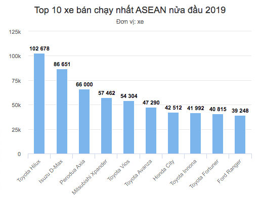 Theo số liệu mới nhất của Focus2move, chỉ tính riêng 6 tháng đầu năm 2019 thị trường ô tô các quốc gia ở Đông Nam Á (ASEAN) tiêu thụ 1.659.850 xe, tăng 2,5% so với cùng kỳ năm ngoái. Trong đó Toyota Hilux đang thống trị bảng xếp hạng. Tiếp đến là các mẫu Isuzu D-Max, Perodua Axia, Mitsubishi Xpander, Honda City.