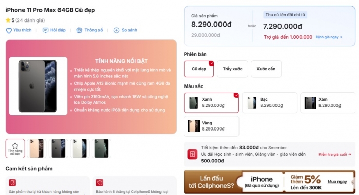 Theo đó, iPhone 11 Pro Max bản 64GB cũ đẹp hiện chỉ từ 8.2 triệu đồng. Mức giá rẻ hơn cả iPhone 11 64GB hàng tồn vẫn đang được bán mới.