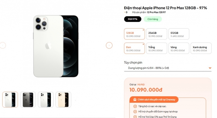 Giá iPhone 12 Pro Max cũ trên thị trường hiện khá thấp khi chỉ từ 10.09 triệu đồng cho bản tiêu chuẩn 128GB. Các phiên bản 256GB và 512 đắt hơn lần lượt từ 11.69 và 12.49 triệu đồng.