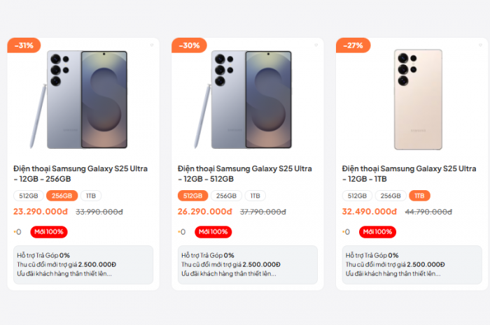 - Galaxy S25 Ultra - 12/256GB: 23.29 triệu đồng;