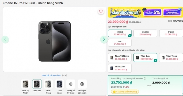 Tại thời điểm đầu tháng 10, iPhone 15 Pro hiện vẫn có hàng mới đập hộp với giá chỉ từ 23.89 triệu đồng cho bản tiêu chuẩn 128 GB. Mức giá này rẻ hơn tới hơn 10 triệu đồng so với iPhone 17 Pro mới. Nếu mua hàng xách tay, iPhone 15 Pro có thể thấp hơn giá chính hãng tới gần 2 triệu đồng.
