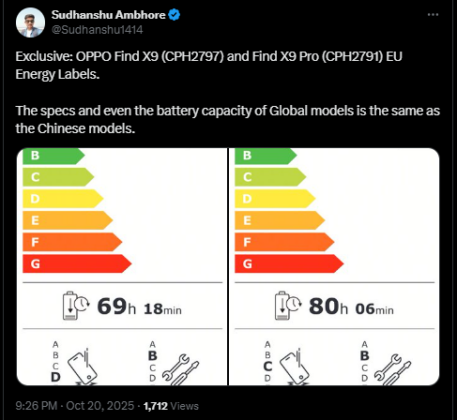 Các nguồn rò rỉ mới đây đã chia sẻ danh sách Nhãn năng lượng EU cho Find X9 (mẫu CPH2797) và Find X9 Pro (CPH2791) cho thấy phiên bản quốc tế cũng sẽ không quá khác bản nội địa trung và chắc chắn sẽ có pin khủng hơn 7000 mAh. Điều này làm tăng thêm sức hấp dẫn trước iPhone 17.