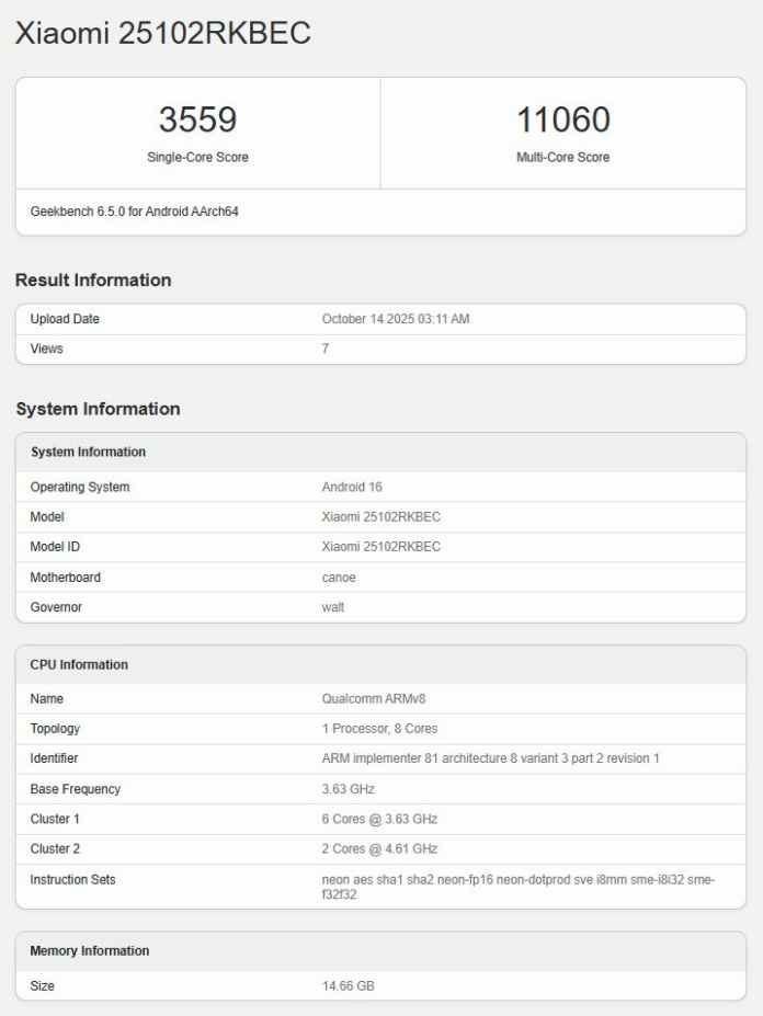 Kết quả Geekbench của Redmi K90 Pro cho thấy máy được trang bị chip Qualcomm với hai lõi hoạt động ở tốc độ 4,21 GHz và sáu lõi hoạt động ở tốc độ 3,6 GHz. Điều này cho thấy điện thoại được trang bị chip Snapdragon 8 Elite Gen 5 mới nhất.