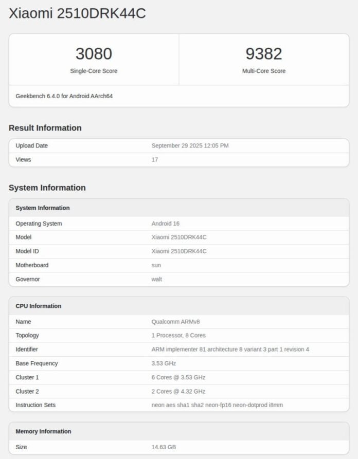 Redmi K90 mới của Xiaomi vừa được phát hiện trên nền tảng GeekBench với số model 2510DRK44C. Theo danh sách chứng nhận, Redmi K90 đã đạt được điểm số ấn tượng 3080 điểm trong bài kiểm tra lõi đơn và 9382 điểm trong bài kiểm tra đa lõi.
