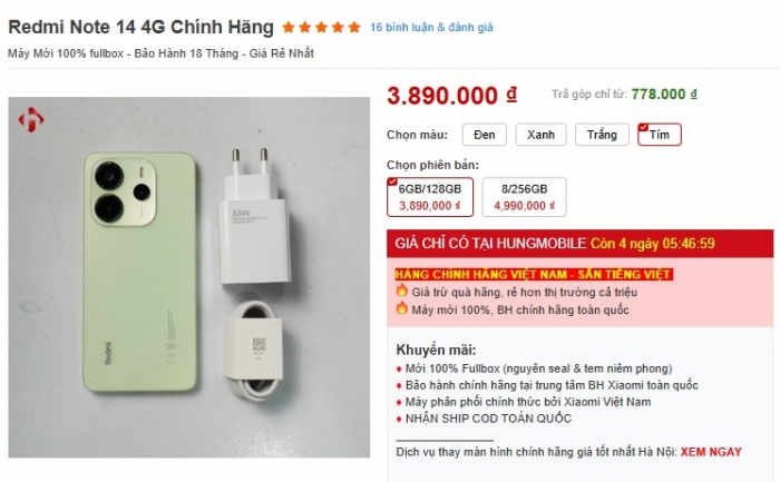 - Redmi Note 14 - 6/128GB: 3.89 triệu đồng;