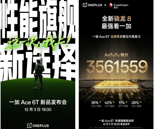 OnePlus sẽ công bố Ace 6T tại Trung Quốc vào ngày 3 tháng 12. Đây là điện thoại thứ hai trong dòng sản phẩm này sau OnePlus Ace 6 và là điện thoại đầu tiên ra mắt với bộ vi xử lý Snapdragon 8 Gen 5 mới của Qualcomm.