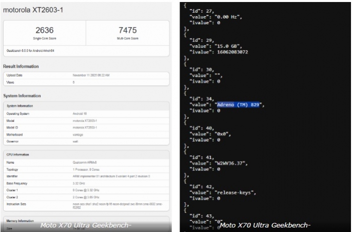 Danh sách Geekbench tiết lộ thêm rằng Moto X70 Ultra có RAM 16GB và Android 16. Máy đạt 2.634 điểm trong bài kiểm tra lõi đơn và 7.475 điểm trong bài kiểm tra đa lõi.