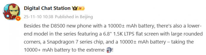 Theo nguồn tin uy tín từ chuyên gia Digital Chat Station, mẫu smartphone pin 10.000mAh sắp ra mắt sẽ được trang bị chip Snapdragon series 7 và màn hình OLED 6,8 inch độ phân giải 1,5K. Nói thêm về màn hình, nguồn tin cho biết máy sẽ có thiết kế phẳng với các góc bo tròn.