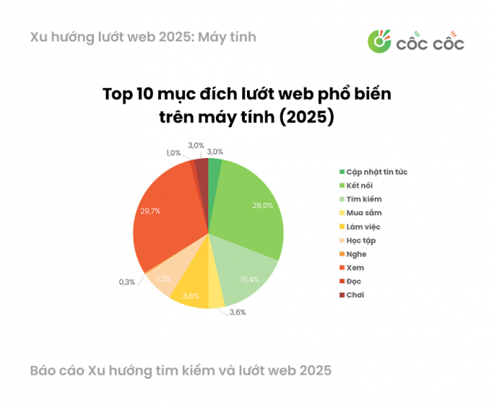 Trong năm 2025, dữ liệu từ Cốc Cốc cho thấy ba mục đích lướt web phổ biến nhất là Xem (34,2%), Kết nối (23,5%) và Tìm kiếm (16,1%). Đáng chú ý, nhu cầu Cập nhật tin tức tăng mạnh 53% và tổng lượng truy cập cho các nhu cầu giải trí (Nghe, Xem, Đọc, Chơi) tăng 132% so với năm 2024.