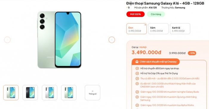 - Galaxy A16 4G - 4/128GB: 3.49 triệu đồng;