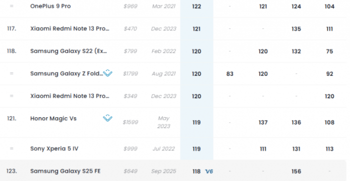 Theo kết quả thử nghiệm của DxOMark, S25 FE đạt 118 điểm, xếp thứ 123 trong bảng xếp hạng camera toàn cầu của trang web này. Điều đó có nghĩa là nó xếp sau các thiết bị được ra mắt vài năm trước, bao gồm iPhone 12 Pro Max, iPhone 13 và Google Pixel 6a ra mắt năm 2022, vốn đạt 122 điểm.