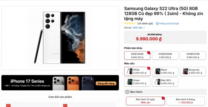 Đầu năm 2026, Galaxy S22 Ultra cũ đẹp như mới có giá chưa đầy 10 triệu cho bản 128GB trong khi đó các phiên bản dung lượng cao cũng đắt hơn không nhiều từ 10 - 11 triệu đồng. Dù rẻ nhưng nó không chỉ có ngoại hình tương đồng Galaxy S25 Ultra mà nhiều trang bị cũng giống và thua kém chủ yếu về hiệu năng.