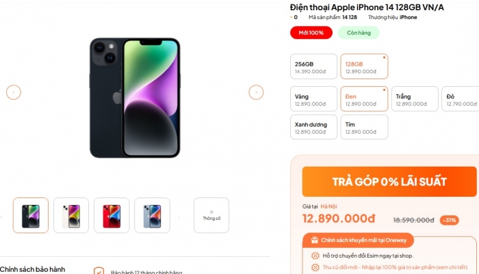 Bước sang năm mới 2026, giá iPhone 14 hiện vẫn duy trì ở mức hơn 12 triệu đồng cho bản 128GB. Bản 256 GB từ 14.39 triệu đồng. Đây là mức giá thấp duy trì từ cuối năm ngoái và ngang với smartphone tầm trung.