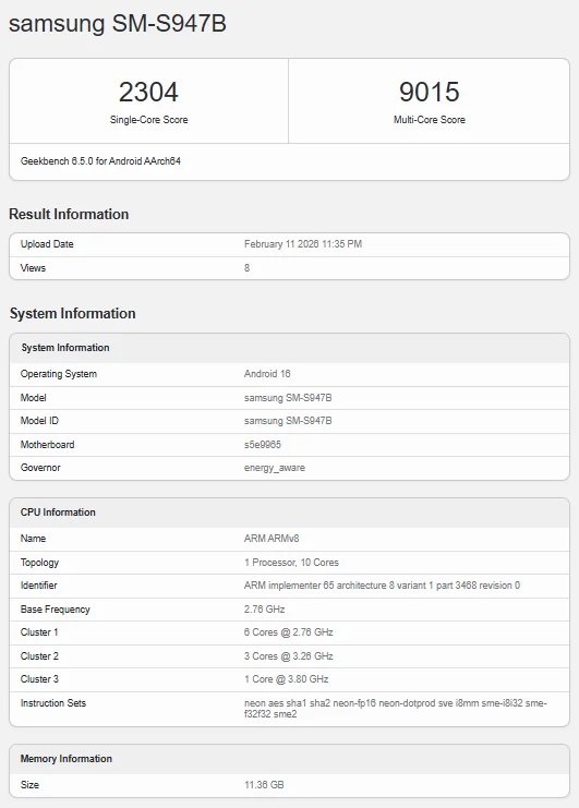 Chiếc điện thoại Samsung SM-S947B xuất hiện trên Geekbench là phiên bản toàn cầu của Galaxy S26 Plus . Thiết bị này được xác định là trang bị chip Exynos 2600, được ghi nhận với mã số linh kiện s5e9965. Do đó, có vẻ như S26 Plus sẽ được bán ra với chip Exynos của Samsung ở hầu hết các thị trường.
