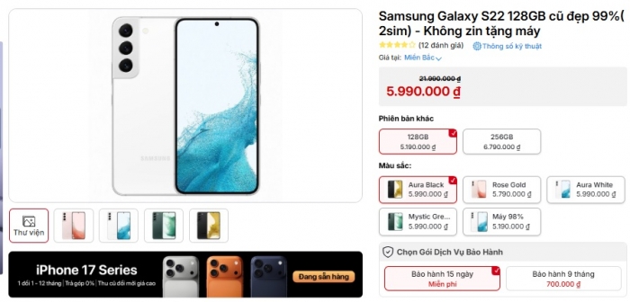 Tại thời điểm giữa tháng 3/2026, Galaxy S22 cũ như mới với giá khoảng 5.6 triệu đồng cho tùy chọn tiêu chuản 8/128GB. Mức giá này thấp hơn khoảng 1 triệu so với iPhone 11 64GB và chỉ bằng nửa so với một chiếc iPhone 14 đập hộp.