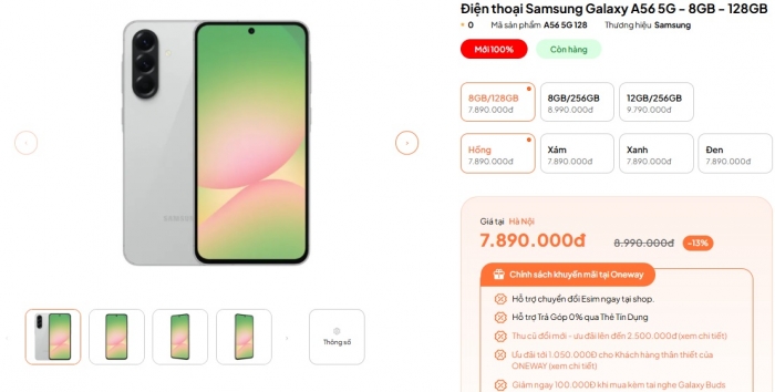 Tại thời điểm đầu tháng 3/2026, giá Galaxy A56 5G thấp nhất hiện từ 7.78 triệu đồng cho bản 8/128 GB; bản 8/256GB và 12/256GB có giá lần lượt từ 8.89 và 9.79 triệu đồng. So với iPhone 17e mới ra mắt giá đắt hơn 10 triệu nhưng có màn chỉ 60Hz và camera đơn, Galaxy A56 thực sự hấp dẫn hơn hẳn.