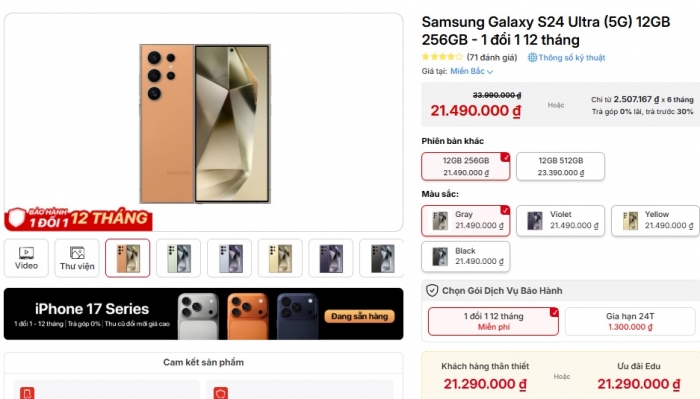 Theo đó, giá Galaxy S24 Ultra hiện chỉ từ 21.49 triệu đồng cho bản 256GB tiêu chuẩn. Đây cũng là phiên bản còn hàng nhiều nhất trong khi các phiên bản khác hầu như hết hàng và chỉ có thể mua cũ.