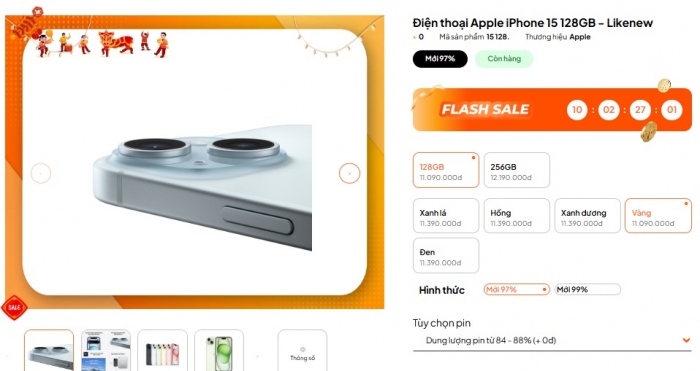 iPhone 15 cũ hiện có giá chỉ từ 11.09 triệu đồng, tiết kiệm đến gần 6 triệu so với mua mới. Thậm chí nó còn rẻ hơn cả iPhone 13 mới đập hộp. Các bản dung lượng cao hơn của iPhone 15 cũng chỉ nhỉnh hơn khoảng 1 triệu đồng.