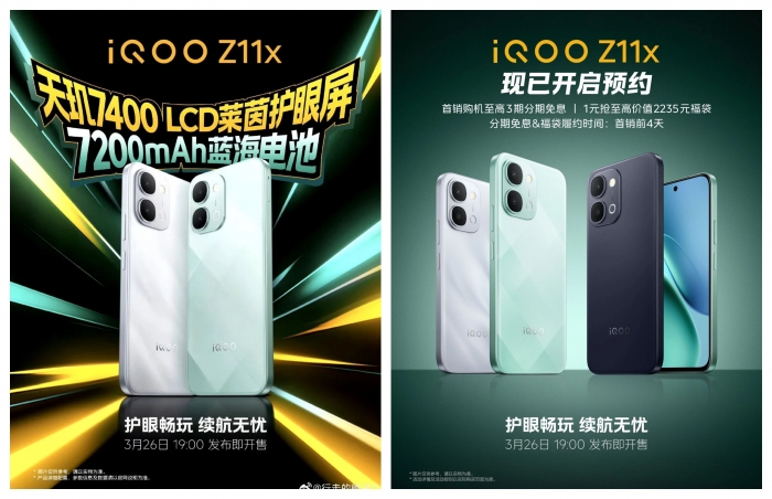 Cùng với Z11, iQOO cũng sẽ giới thiệu Z11x, với màn hình LCD 6,76 inch tích hợp tính năng bảo vệ mắt, chip Dimensity 7400 và pin 7200mAh hỗ trợ sạc nhanh 44W. Sản phẩm sẽ có các màu bạc, xanh bạc hà và xanh đậm.