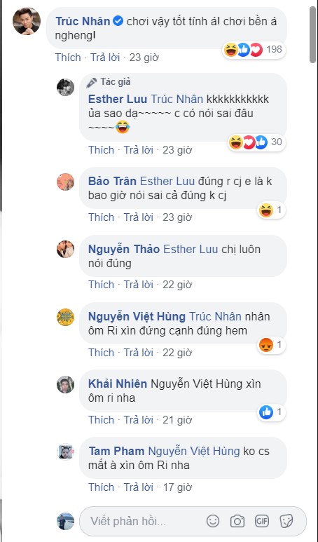 Thế nhưng, Trúc Nhân – một người bạn thân thiết của Trấn Thành và cũng là người xuất hiện trong bức ảnh này lại bày tỏ sự giận dỗi với người đàn chị. Nam ca sĩ để lại bình luận với giọng điệu hờn dỗi: “Chơi vậy tốt tính á! Chơi bền á ngheng!”.