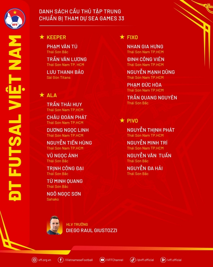 Đội tuyển futsal Việt Nam sẽ chính thức hội quân trở lại vào ngày 10/11 tại TP.HCM nhằm chuẩn bị cho SEA Games 33. HLV Diego Giustozzi đã triệu tập 20 cầu thủ có phong độ tốt nhất, trong đó bao gồm những gương mặt kỳ cựu từng chinh chiến quốc tế và một số tài năng trẻ triển vọng.